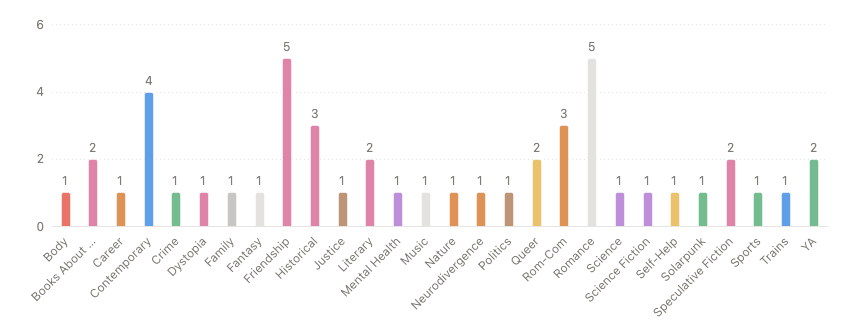 Looking at everything I read in the month, now - since I’ve started using Notion, it’s really easy for me to put tags on my reading and see the themes of everything in aggregate. It’s no great surprise that romances, books about friendship, and contemporary settings were the most present in my September reading - those are things I go back to time and time again.