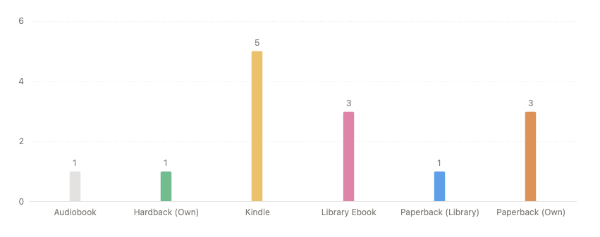 Coming back to the goals I’ve been sharing on a weekly basis, it’s also nice to see that I’ve been chugging my way through books on my Kindle as well as physical books on my bookshelf in roughly equal proportion.